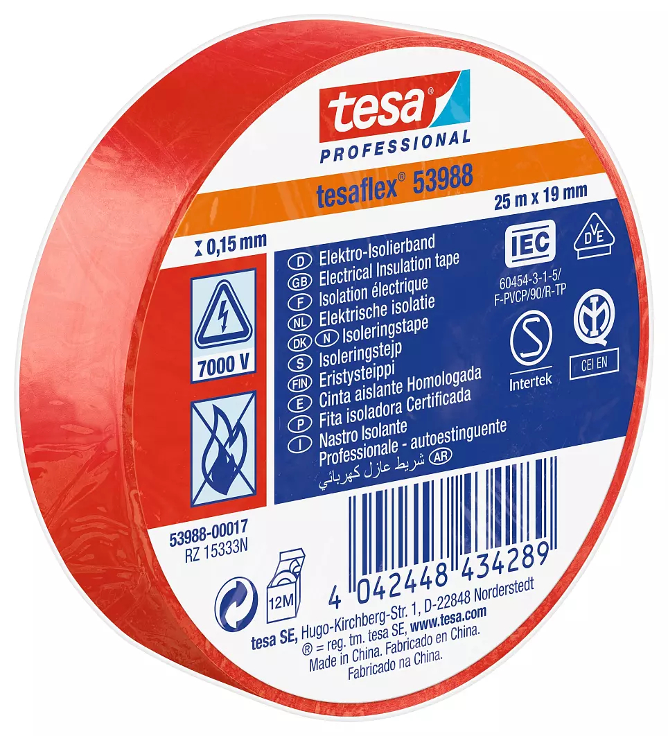 This is 53988 Red PVC Electrical Tape 19mm x 25m manufactured by Tesa. The manufacturer part number is 53988-00017-01. It is assigned with a trade name of tesa 53988. It has a decent red colour. It is 150mm thick. Furthermore, the product is 19mm wide. Its accurate length is 25m. It has a maximum operating temperature of +90°c. Whereas, its backing is made using soft pvc material .
