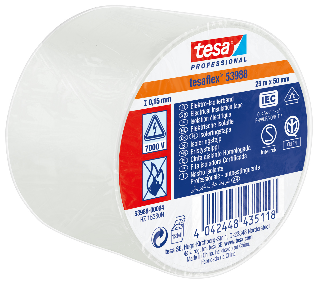 This is SPVC ELECTRICAL White PVC Electrical Insulation Tape 50mm x 25m manufactured by Tesa. The manufacturer part number is 53988-00064-00. It is assigned with a trade name of spvc electrical. It has a decent white colour. It is 0.15mm thick. Furthermore, the product is 50mm wide. Its accurate length is 25m. Whereas, its backing is made using pvc material .