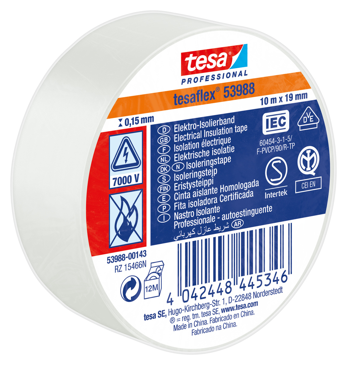 This is SPVC ELECTRICAL White PVC Electrical Insulation Tape 19mm x 10m manufactured by Tesa. The manufacturer part number is 53988-00143-00. It is assigned with a trade name of spvc electrical. It has a decent white colour. It is 0.15mm thick. Furthermore, the product is 19mm wide. Its accurate length is 10m. Whereas, its backing is made using pvc material .
