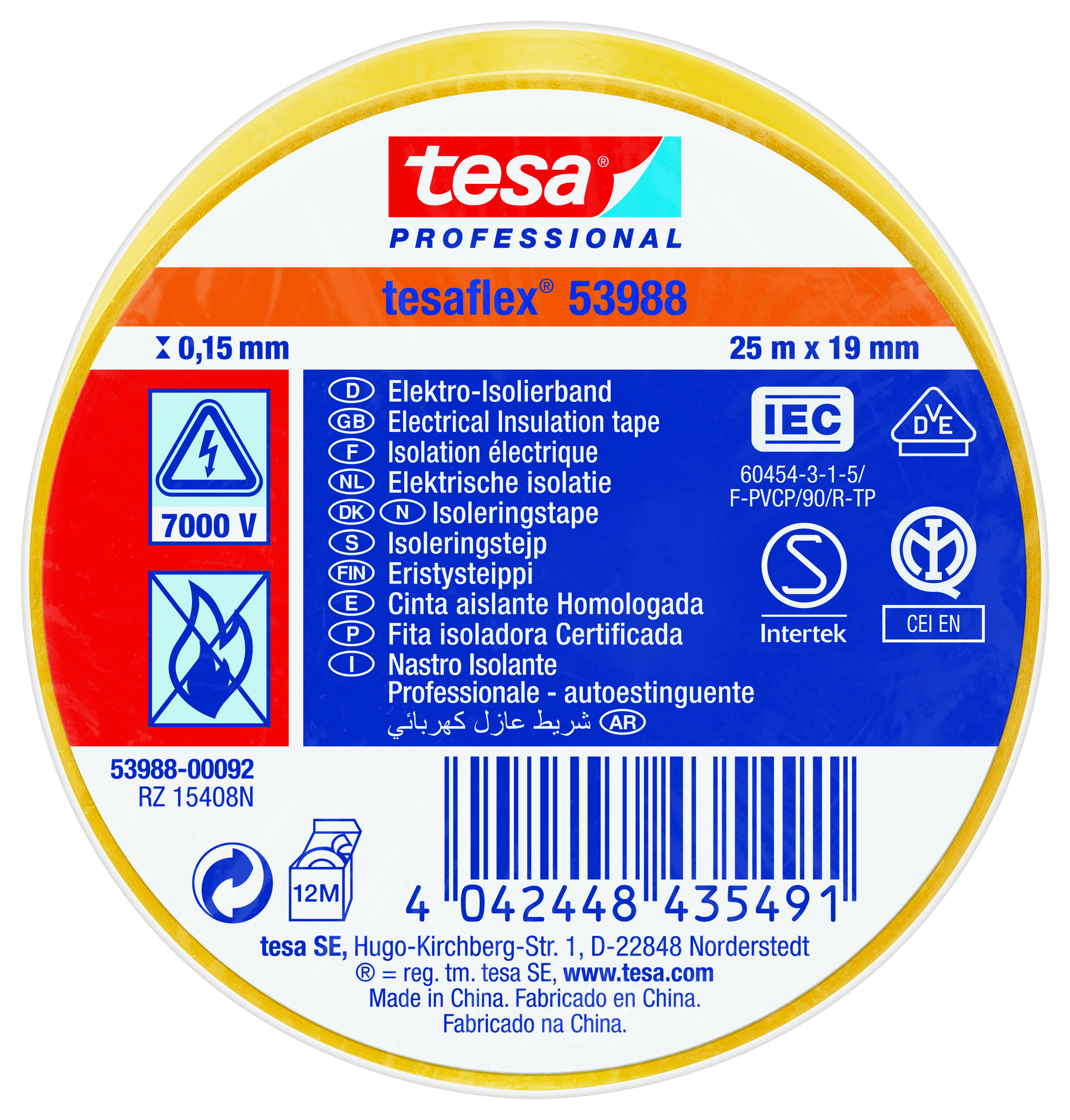 This is 53988 Yellow Soft PVC Electrical Insulation Tape 19mm x 25m manufactured by Tesa. The manufacturer part number is 53988-00092-01. It is assigned with a trade name of tesa 53988. It has a decent yellow colour. It is 150mm thick. Furthermore, the product is 19mm wide. Its accurate length is 25m. It has a maximum operating temperature of +90°c. Whereas, its backing is made using soft pvc material .
