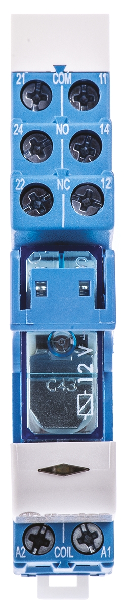 This is DPDT DIN Rail Interface Relay Module Screw 8A 12V dc manufactured by Finder. The manufacturer part number is 48.52.7.012.0050SPA. The given dimensions of the product include 15.8 x 75.3 x 78.6mm. The coil voltage of the product is 12v dc. It has a 15ms turn On time. The given turn off time is 12ms. It has about 41ma input current . It is capable of doing 10000000 cycles in a lifetime . The product complies with all safety standards, such as ce, eac. The product's switching voltage is 250v. Moreover, it has approximately 292.68ω input resistance . It has a maximum operating temperature of +70°c. The terminal is a screw type. The product has -40 → +70°c of operating temperature range. The contact is equipped with dpdt configuration. The product comes in 75.3mm depth. The product is available in din rail configuration. The product 48 series, is a highly preferred choice for users. Its accurate length is 15.8mm. In addition, the height is 78.6mm. Whereas, the minimum operating temperature of the product is -40°c. It has equipped with 2 poles. The product is made from sturdy silver alloy materials.
