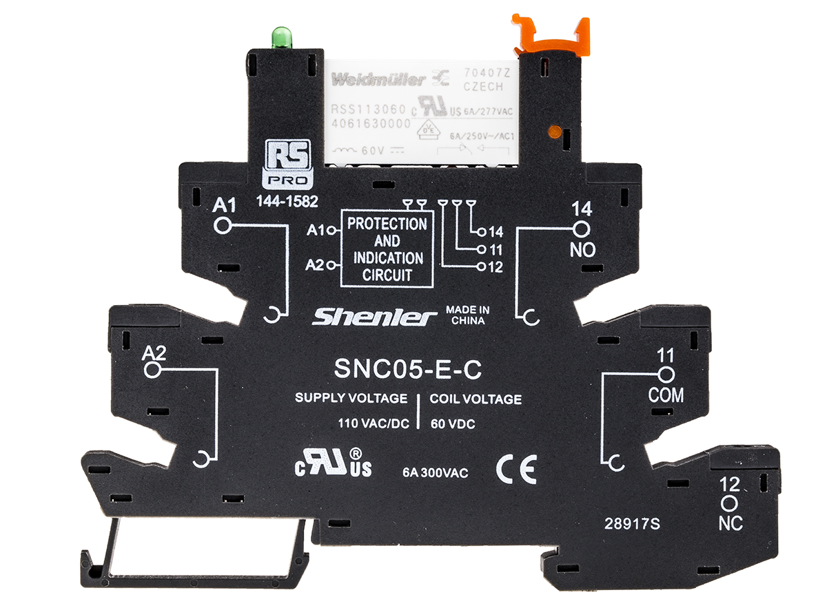 This is 110V ac DIN Rail Interface Relay Module SPDT 300V dc manufactured by RS Pro. The manufacturer part number is 144-1582. The product is available in din rail configuration. The product has -40 → +85°c of operating temperature range. It has 300v dc of input voltage range. The coil voltage of the product is 110v ac. Its accurate length is 96mm. In addition, the height is 78.8mm. The product comes in 6.2mm depth. Whereas, the minimum operating temperature of the product is -40°c. The contact is equipped with spdt configuration. It has a maximum operating temperature of +85°c. It has about 6a load current rating . It has about 8a input current . 110v dc is the maximum voltage of the bespoke product.