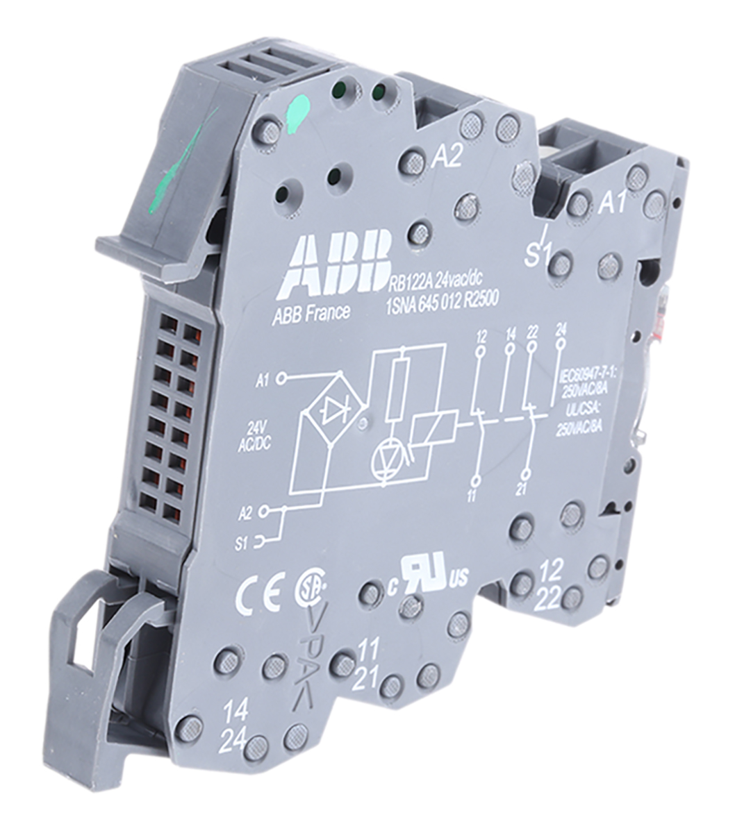 This is 24V ac/dc DPDT Interface Relay Module DIN Rail R600 manufactured by ABB. The manufacturer part number is 1SNA645012R2500 RB122G-24VUC. The given dimensions of the product include 70 x 12 x 75mm. The coil voltage of the product is 24v ac/dc. It has a 6ms turn On time. The given turn off time is 10ms. It has about 20ma input current . The product complies with all safety standards, such as ccc, ce, csa, curus. The product's switching voltage is 24v. It has a maximum operating temperature of +70°c. The terminal is a screw type. This is basically a ac interface relay. The product has -20 → +70°c of operating temperature range. It has a 24v ac voltage load rating . The contact is equipped with dpdt configuration. Its accurate length is 70mm. It has a interface relay switching relay configuration . The product also provides special features, such as high levels flame retardation. The product is available in din rail configuration. The product r600, is a highly preferred choice for users. It has 24v of input voltage range. It is a type of interface relay accessory. The product comes in 12mm depth. In addition, the height is 75mm. Whereas, the minimum operating temperature of the product is -20°c. The product has 5v of minimum input voltage. It has about 1 → 8000ma load current rating . 250v is the maximum voltage of the bespoke product.