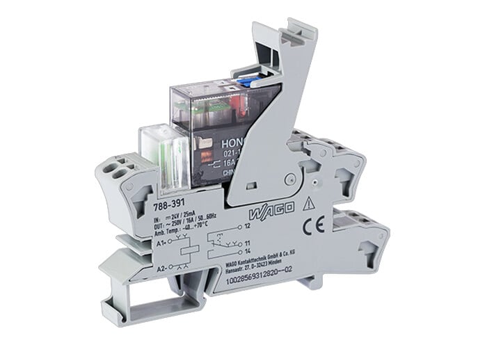 This is 788 Series Relay Module DIN Rail Mount 24V dc Coil SPDT 1-Pole 16A Load manufactured by WAGO. The manufacturer part number is 788-391. The product is available in din rail configuration. The product 788, is a highly preferred choice for users. The coil voltage of the product is 24v dc. The contact is equipped with spdt configuration. It has equipped with 1 poles. It has about 16a load current rating .