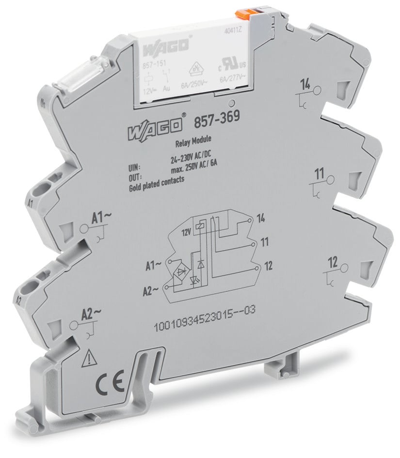 This is 857 Series Relay Module DIN Rail Mount 24 → 230V ac/dc Coil SPDT 1-Pole 6A Load manufactured by WAGO. The manufacturer part number is 857-369. The product is available in din rail configuration. The product 857, is a highly preferred choice for users. The coil voltage of the product is 24 → 230v ac/dc. The contact is equipped with spdt configuration. It has equipped with 1 poles. It has about 6a load current rating .