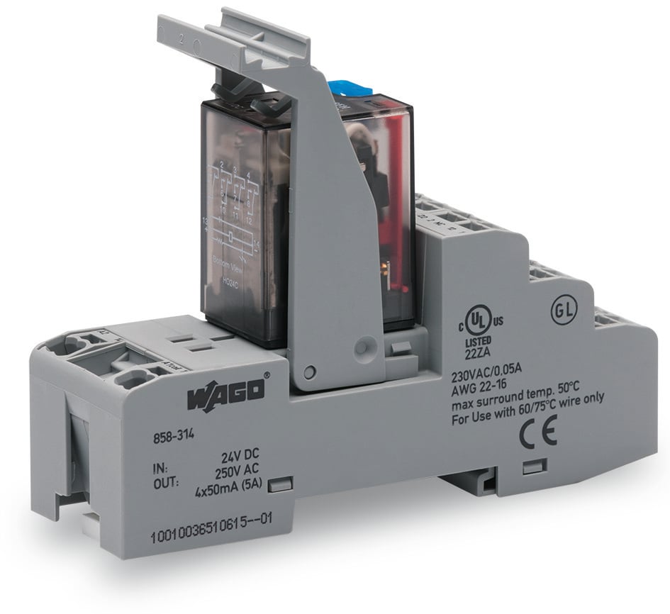 This is 858 Series Relay Module DIN Rail Mount 24V dc Coil 4PDT 4-Pole 5A Load manufactured by WAGO. The manufacturer part number is 858-314. The product is available in din rail configuration. The product 858, is a highly preferred choice for users. The coil voltage of the product is 24v dc. The contact is equipped with 4pdt configuration. It has equipped with 4 poles. It has about 5a load current rating .