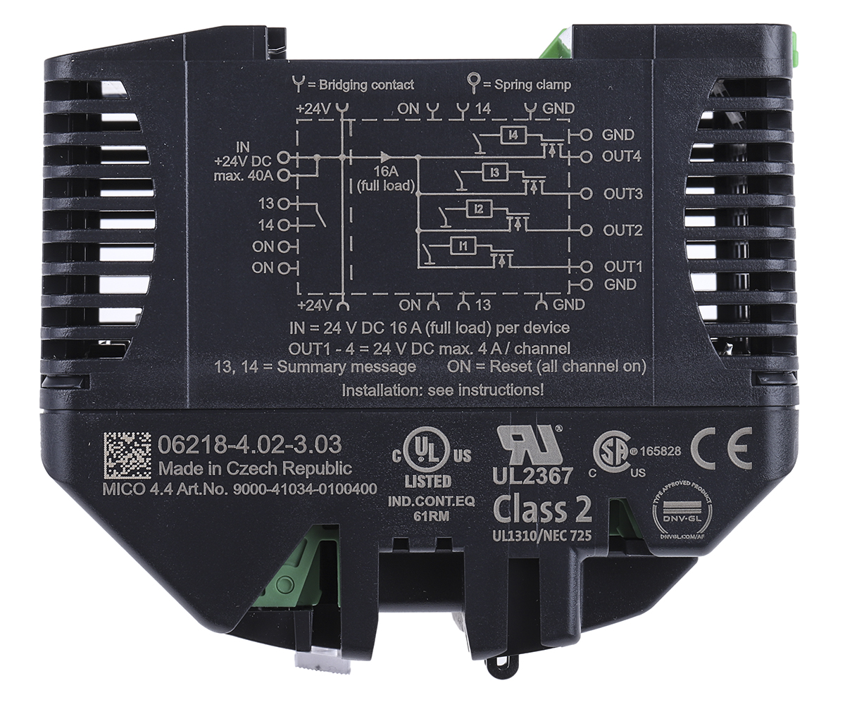This is MICO Intelligent 24 V dc Circuit Protection 4 Channels 1 → 4 A manufactured by Murrelektronik Limited. The manufacturer part number is 9000-41034-0100400.
