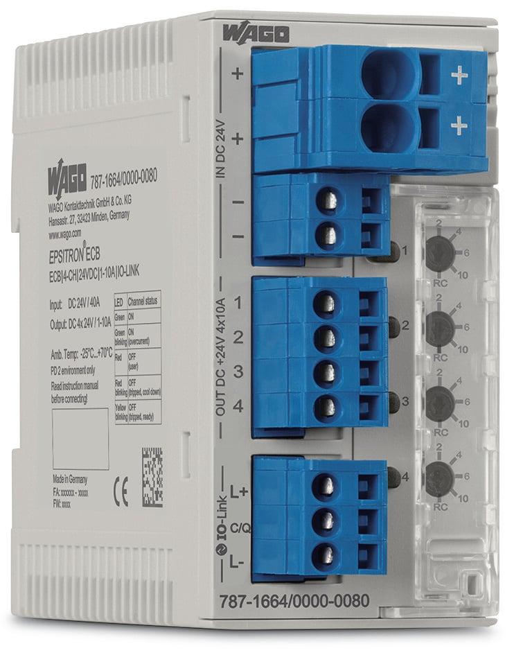 This is Electronic Circuit Breaker 10A 24V 787 4 channels DIN Rail manufactured by WAGO. The manufacturer part number is 787-1664/000-080. The product is available in din rail style. The product 787, is a highly preferred choice for users. The product has a current rating of 10a. It is supplied with 4 channels. The product has a rated DC voltage of 24v.