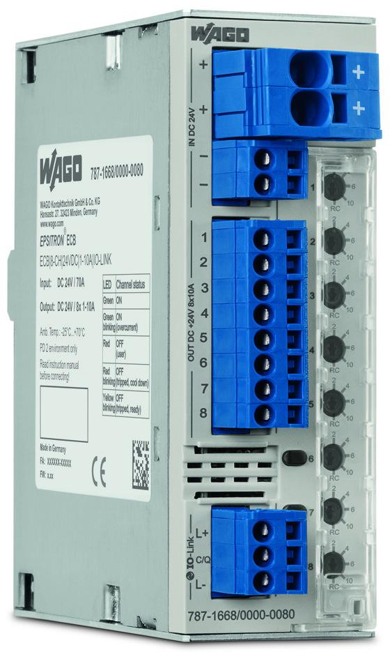 This is Electronic Circuit Breaker 10A 24V 787 8 channels DIN Rail manufactured by WAGO. The manufacturer part number is 787-1668/000-080. The product is available in din rail style. The product 787, is a highly preferred choice for users. The product has a current rating of 10a. It is supplied with 8 channels. The product has a rated DC voltage of 24v.