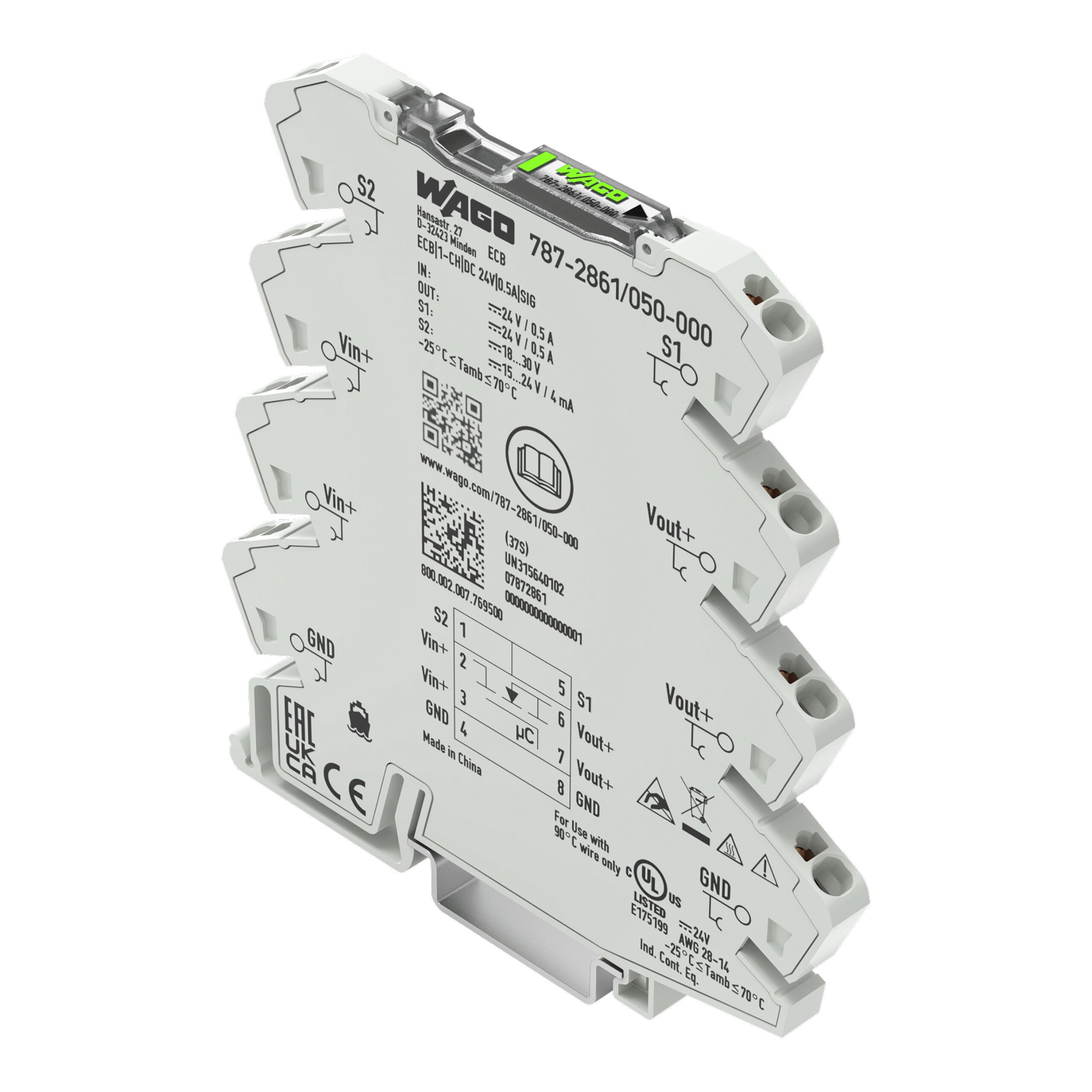 This is Electronic Circuit Breaker 500mA 24V 787 1 channels DIN Rail manufactured by WAGO. The manufacturer part number is 787-2861/050-000. The product is available in din rail style. The product 787, is a highly preferred choice for users. The product has a current rating of 500ma. It is supplied with 1 channels. The product has a rated DC voltage of 24v.
