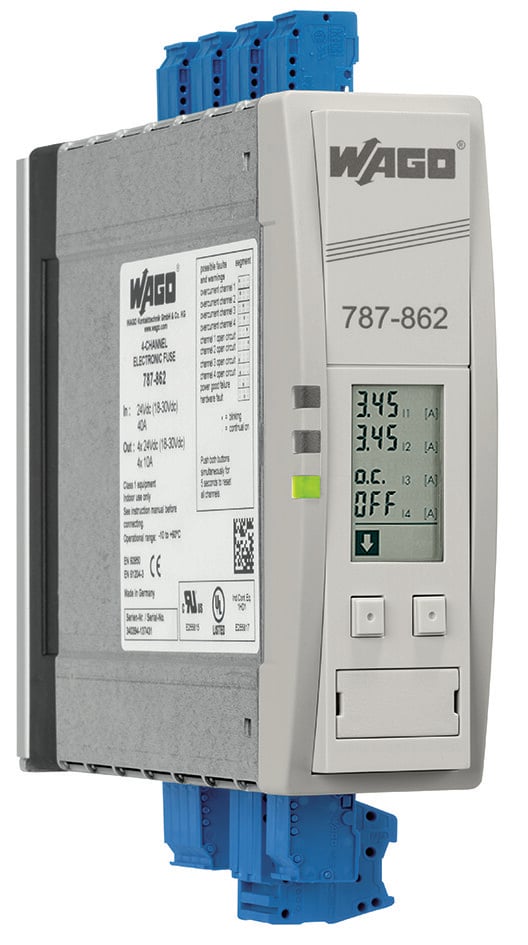 This is Electronic Circuit Breaker 10A 24V 787 4 channels DIN Rail manufactured by WAGO. The manufacturer part number is 787-862. The product is available in din rail style. The product 787, is a highly preferred choice for users. The product has a current rating of 10a. It is supplied with 4 channels. The product has a rated DC voltage of 24v.