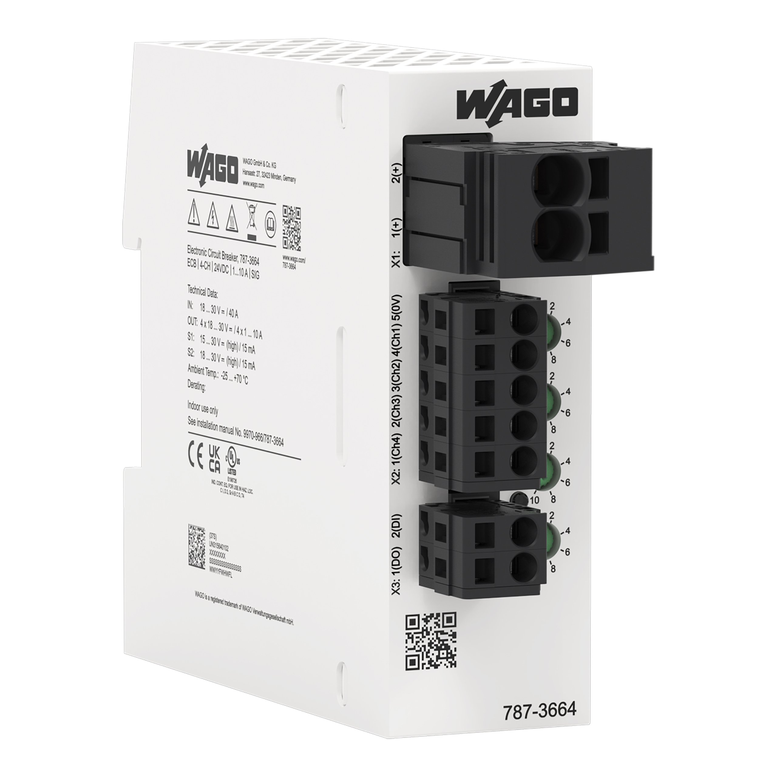 This is Electronic Circuit Breaker 10A 24V 787 4 channels DIN Rail manufactured by WAGO. The manufacturer part number is 787-3664. The product is available in din rail style. The product 787, is a highly preferred choice for users. The product has a current rating of 10a. It is supplied with 4 channels. The product has a rated DC voltage of 24v.