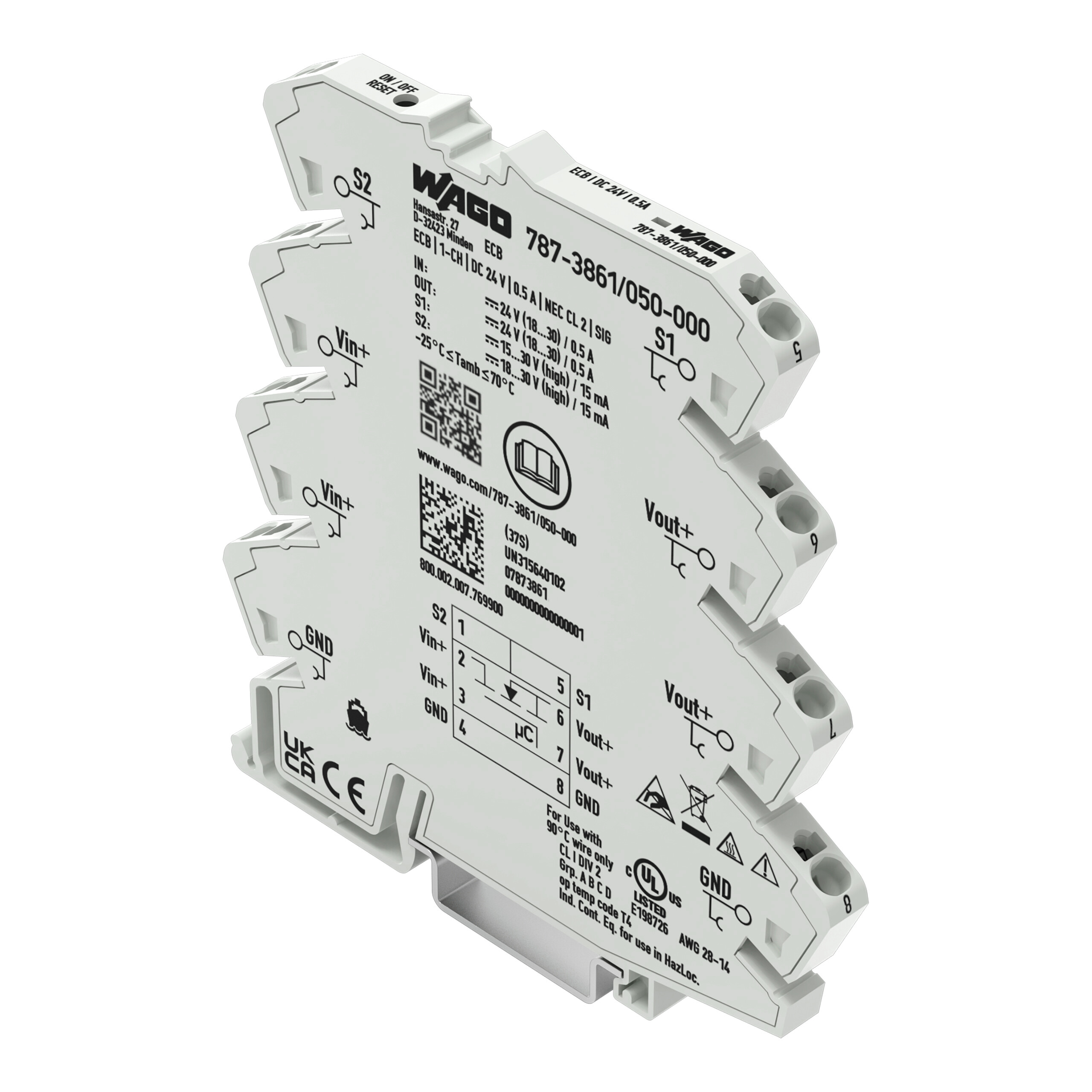 This is Electronic Circuit Breaker 500mA 24V 787 1 channels DIN Rail manufactured by WAGO. The manufacturer part number is 787-3861/050-000. The product is available in din rail style. The product 787, is a highly preferred choice for users. The product has a current rating of 500ma. It is supplied with 1 channels. The product has a rated DC voltage of 24v.