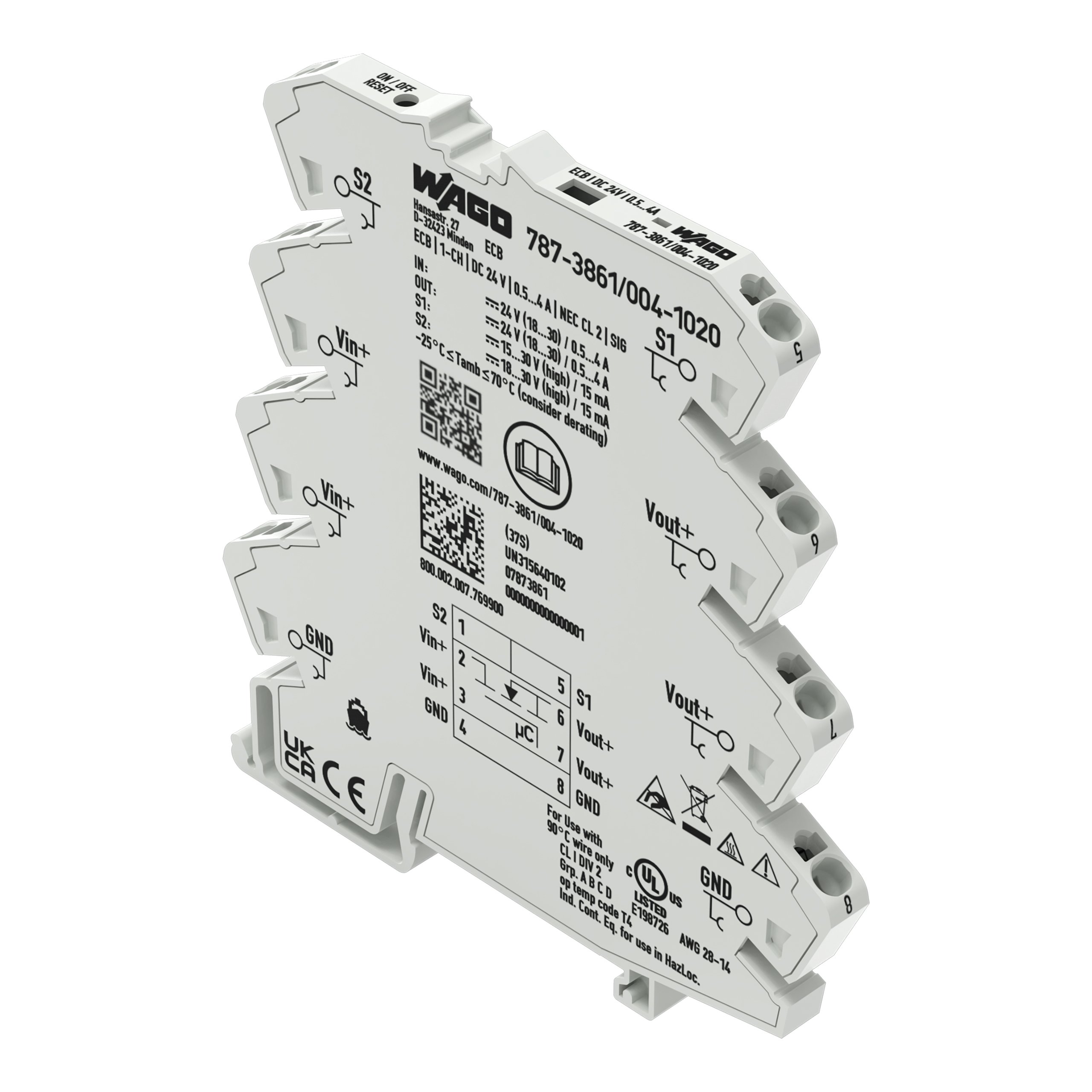 This is Electronic Circuit Breaker 0.5 → 4A 24V 787 1 channels DIN Rail manufactured by WAGO. The manufacturer part number is 787-3861/004-1020. The product is available in din rail style. The product 787, is a highly preferred choice for users. The product has a current rating of 0.5 → 4a. It is supplied with 1 channels. The product has a rated DC voltage of 24v.