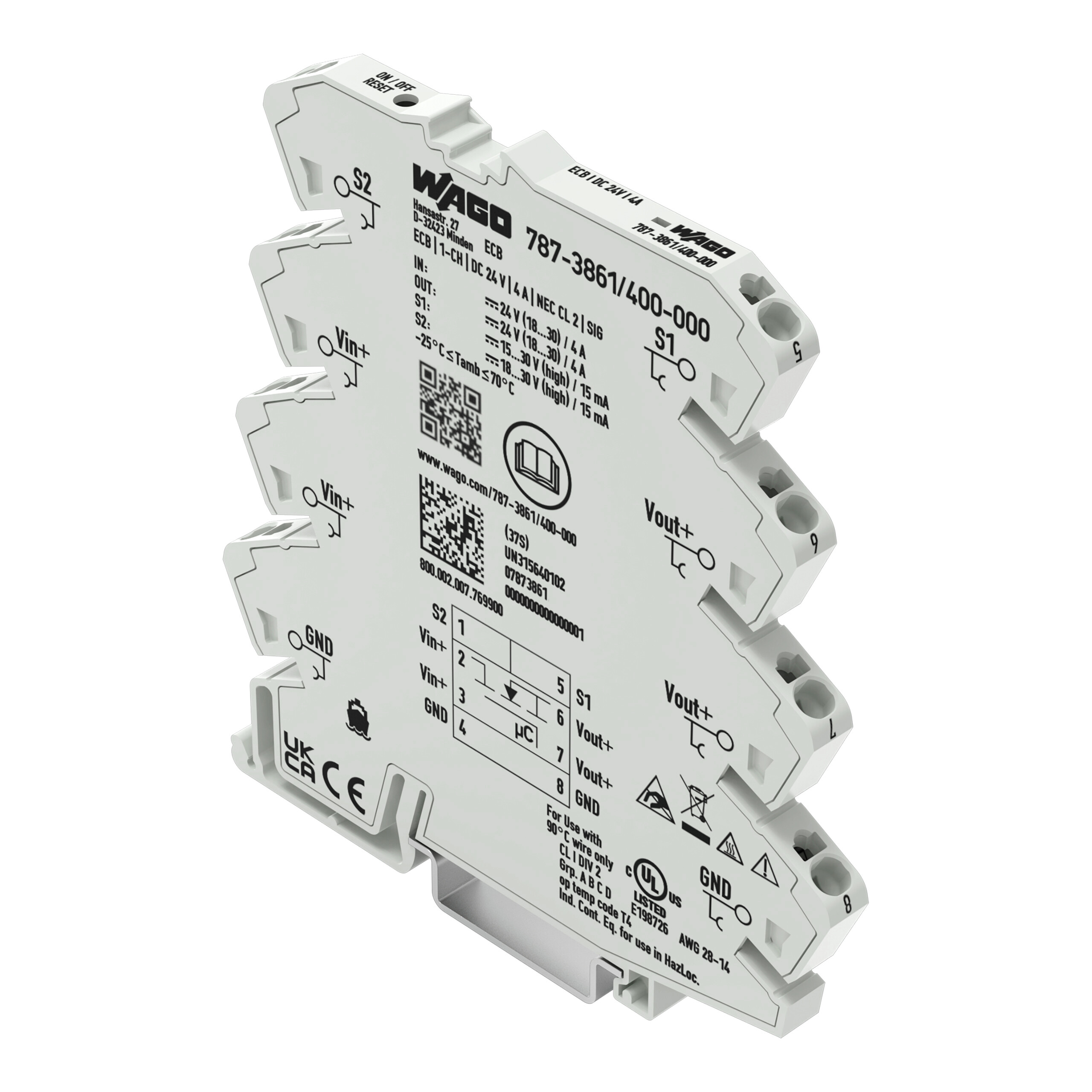 This is Electronic Circuit Breaker 4A 24V 787 1 channels DIN Rail manufactured by WAGO. The manufacturer part number is 787-3861/400-000. The product is available in din rail style. The product 787, is a highly preferred choice for users. The product has a current rating of 4a. It is supplied with 1 channels. The product has a rated DC voltage of 24v.