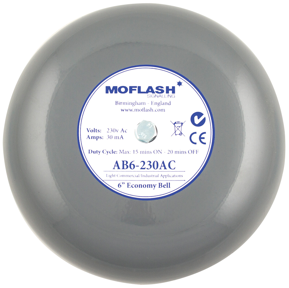 This is Solenoid Fire Bell Single Tone 24 V dc manufactured by Moflash. The manufacturer part number is AB6-24DC. Its diameter is 167 mm. The product has +50°c maximum temperature. The housing has an adorable grey colour. The product complies with all safety standards, such as ce certified ukca. The product also features robust aluminium housing material. It is IP rated with ip44. This product harbours dc current. The product ab6 solenoid, is a highly preferred choice for users. It has a minimum 97db decibel . It contains 100db decibels at 1 meter . The product is available in wall mount style. It has a/an bell type tone . The product is tailored for bell type application . It has 1 tones . While its minimum temperature is -30°c. It has 100db maximum decibels . Its base is 110mm in length . Features 24 v dc supply voltage.