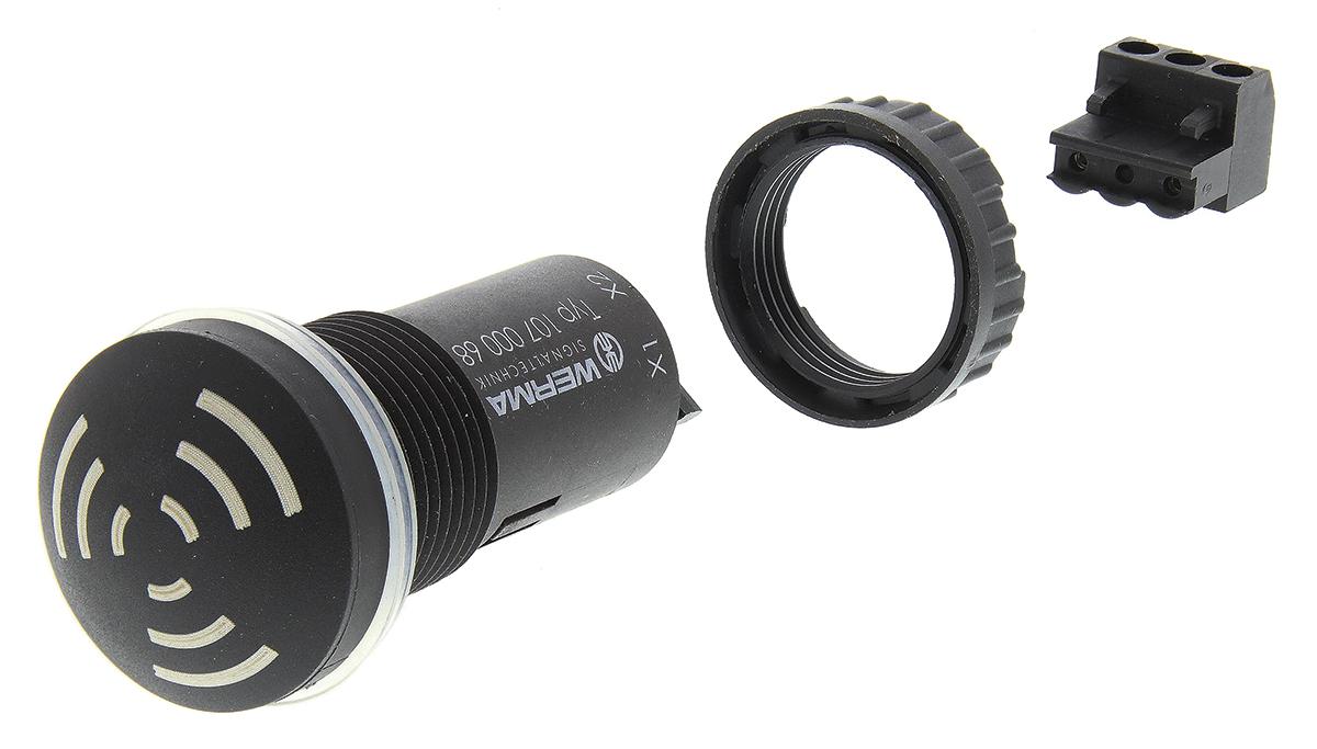 This is Single Tone Buzzer 230 V ac 65dB at 1 Metre manufactured by Werma. The manufacturer part number is 107.010.68. Its diameter is 28 mm. The product has +50°c maximum temperature. While its minimum temperature is -20°c. It contains 65db decibels at 1 meter . The product is available in panel mount style. This product harbours ac current. The product is tailored for buzzer type application . Features 230 v ac supply voltage. It has 1 tones . It has 80db maximum decibels .