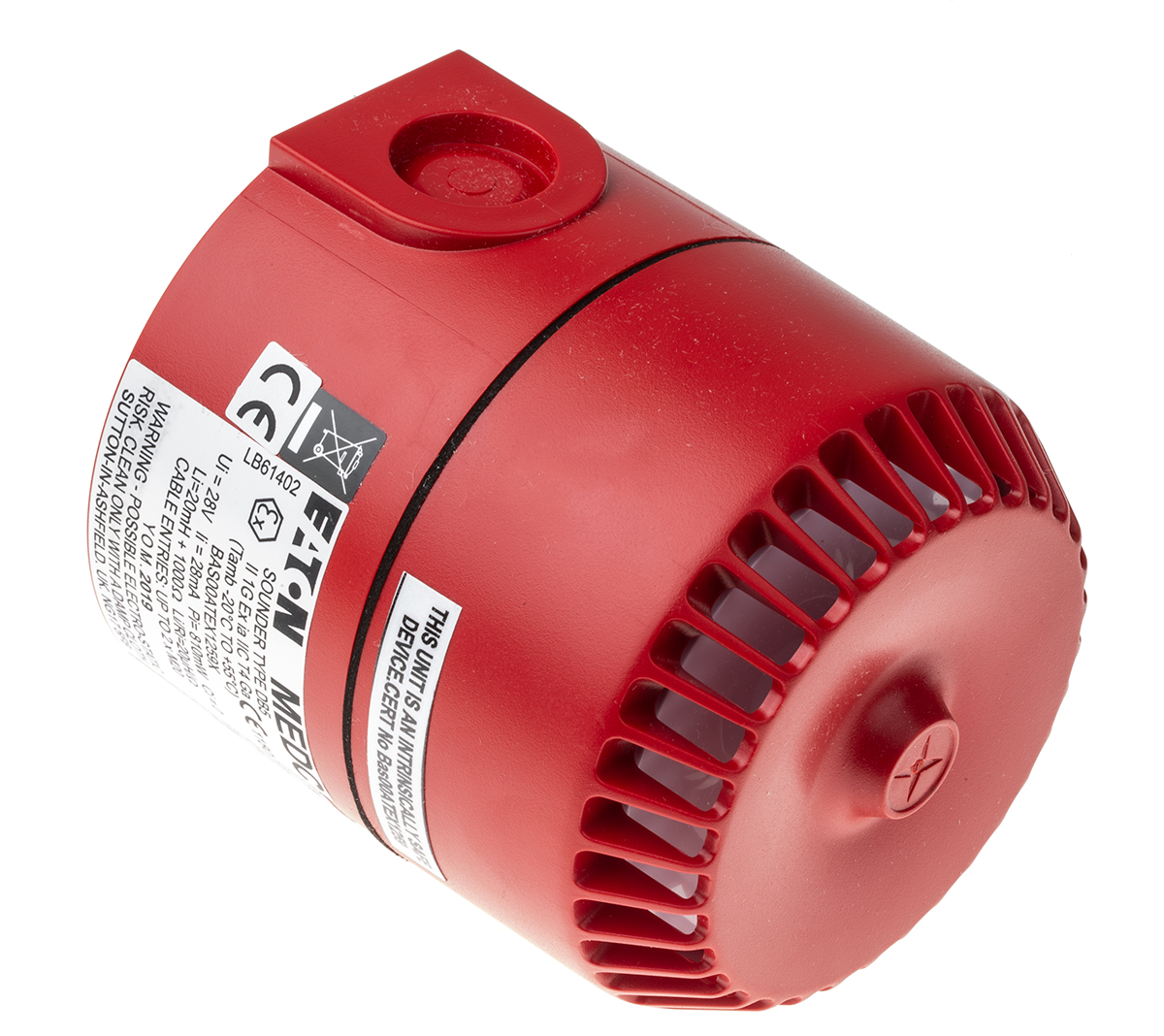 This is Red 24-Tone Electronic Sounder 24 V dc 100dB at 1 Metre Surface Mount IP65 manufactured by Eaton. The manufacturer part number is DB5 24V. Its diameter is 93 mm. The housing has an adorable red colour. The product is certified with atex hazardous area certification. The product has +55°c maximum temperature. The product also features robust abs housing material. It is IP rated with ip65. The product eaton fulleon, is a highly preferred choice for users. It contains 100db decibels at 1 meter . The product is available in surface mount style. This product harbours dc current. The product is tailored for sounder type application . Features 24 v dc supply voltage. It has 24 tones . While its minimum temperature is -20°c. The product also provides special features, such as en54-3.