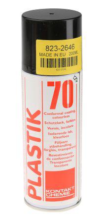 This is Clear Acrylic Resin aerosol Conformal Coating Various Applications manufactured by CRC. The manufacturer part number is 74309. It is assigned with a trade name of plastik 70. It has a decent clear colour. The product is made from highly stable and reliable acrylic resin. In addition, the product has >80kv/mm dielectric strength . Applications Information involves etc, furniture, insulation coils and transformers, ornaments, paintings, paper, protect printed circuit boards, protective coating on metal. The package is a sort of aerosol. Whereas, the minimum operating temperature of the product is -40°c. Its package size is approximately 200 ml . It has a maximum operating temperature of +60°c.