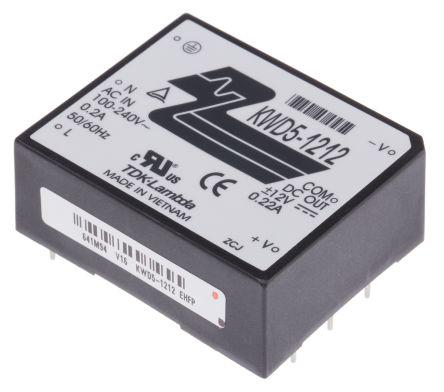 This is 5W Dual Output Embedded Switch Mode Power Supply SMPS ±220mA ±12V manufactured by TDK-Lambda. The manufacturer part number is KWD 5 12 12. Additionally, the product is supplied with 2 outputs. The product has +70°c maximum temperature. The product is available in pcb mount configuration. The typical product's weight is 75g. Furthermore, the product is 45mm wide. While its minimum temperature is -10°c. Its accurate length is 55mm. It is a highly efficient product with an 73% of high efficiency. The product comes in 20.5mm depth. Its input voltage is 85 → 265 v ac, 110 → 340 v dc. The package is a sort of encapsulated. Features a ±12 v dc output voltage. Feature 5w of power rating. It carries ±220ma output current.