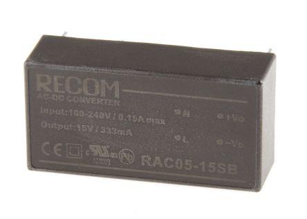 This is 5W Embedded Switch Mode Power Supply SMPS 333mA 15V dc manufactured by Recom. The manufacturer part number is RAC05-15SB. Additionally, the product is supplied with 1 outputs. The product has +70°c maximum temperature. The product is available in pcb mount configuration. The typical product's weight is 30g. Furthermore, the product is 25.4mm wide. While its minimum temperature is -25°c. Its accurate length is 50.8mm. It is a highly efficient product with an 75% of high efficiency. The product comes in 15.16mm depth. Its input voltage is 90 → 264v ac. The package is a sort of encapsulated. Features a 15 v dc output voltage. Feature 5w of power rating. It carries 333ma output current.