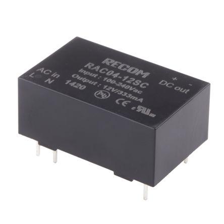 This is 4W Embedded Switch Mode Power Supply SMPS 333mA 12V dc manufactured by Recom. The manufacturer part number is RAC04-12SC. Additionally, the product is supplied with 1 outputs. The product has +60°c maximum temperature. The product is available in through hole configuration. The typical product's weight is 31.5g. Furthermore, the product is 27.2mm wide. While its minimum temperature is -25°c. Its accurate length is 36.7mm. It is a highly efficient product with an 78% of high efficiency. The product comes in 17.1mm depth. Its input voltage is 80 → 305v ac. The package is a sort of encapsulated. Features a 12 v dc output voltage. Feature 4w of power rating. It carries 333ma output current.