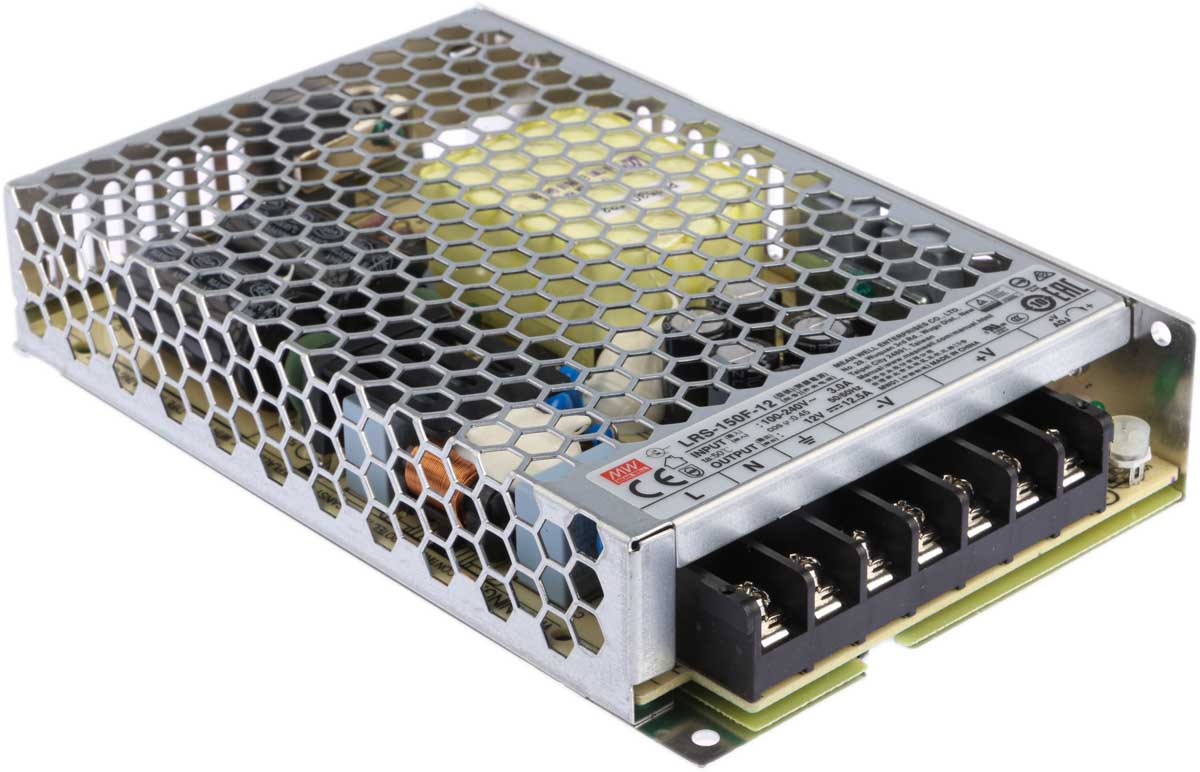 This is 150W Embedded Switch Mode Power Supply SMPS 12.5A 12V dc manufactured by Mean Well. The manufacturer part number is LRS-150F-12. Additionally, the product is supplied with 1 outputs. The product has +70°c maximum temperature. The product is available in chassis mount configuration. The typical product's weight is 480g. It is a highly efficient product with an 87.5% of high efficiency. While its minimum temperature is -30°c. Its accurate length is 159mm. Furthermore, the product is 97mm wide. The product comes in 30mm depth. Its input voltage is 120 → 370 v dc, 85 → 264 v ac. The package is a sort of enclosed. Features a 12v dc output voltage. Feature 150w of power rating. It carries 12.5a output current.
