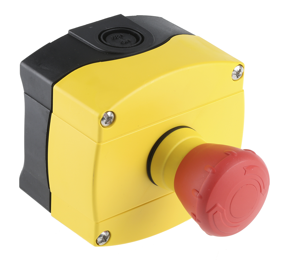 800F Series Emergency Stop, Mushroom Head Yellow/Black plastic enclosure Twist to release operator DIN rail in base of enclosure for contact block mounting Emergency Stop Pushbutton