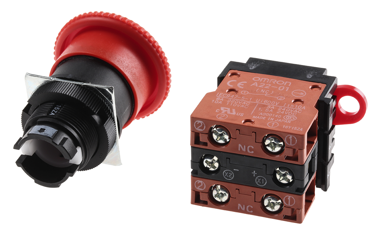 This is Emergency Button Twist to Reset Red 40mm Mushroom Head manufactured by Omron. The manufacturer part number is A22EL-M-24A-02. Illumination Option yes. The product is available in panel mount configuration. It is IP rated with ip65. It has dpst pole and throw configuration. The product a22e, is a highly preferred choice for users. It has a decent red colour. Pushbutton is manufactured from highly rugged and reliable plastic material. It has no high-quality auxiliary contact . The contact is equipped with 2nc configuration. The push button has twist release actuation mechanism.
