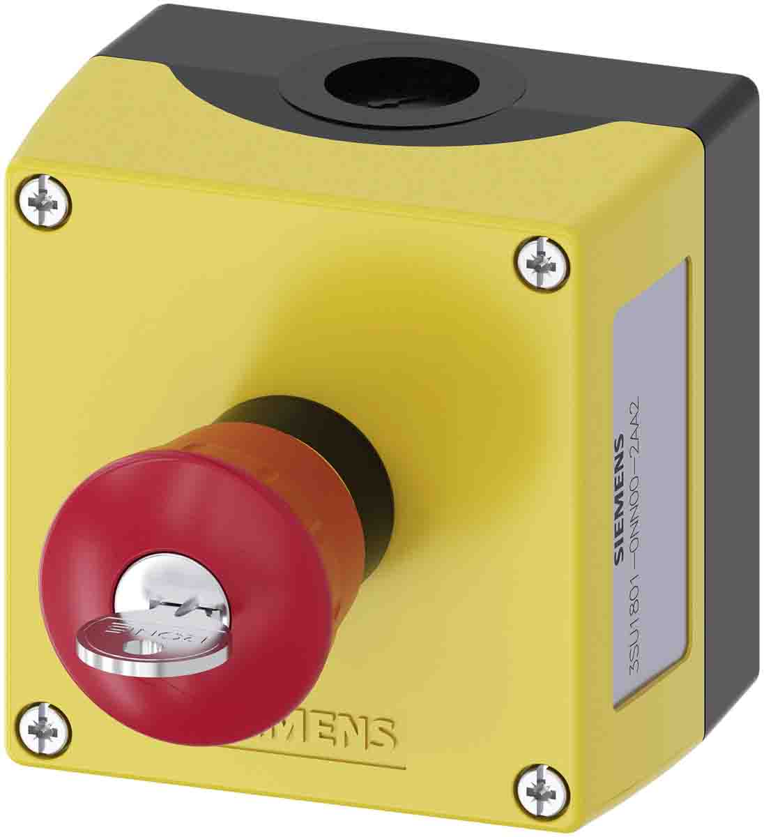 This is Red Key-Operated-Release Round Head Emergency Button manufactured by Siemens. The manufacturer part number is 3SU1801-0NN00-2AA2. Is it a better world product? yes. Illumination Option no. The product is available in surface mount configuration. It is IP rated with ip66, ip67, ip69. The product 3su1, is a highly preferred choice for users. It has a decent red colour. Moreover, the product has a nominal 5 → 500 v ac, 5 → 500v dc voltage rating. It includes a push button of round shape . In addition, the height is 85mm. Furthermore, the product is 85mm wide. The product comes in 109mm depth. Its bezel material is plastic . The contact is equipped with 1 no + 1 nc configuration. It has 2 high-quality auxiliary contact . Pushbutton is manufactured from highly rugged and reliable plastic material. It features 10a supply current. The push button has key release actuation mechanism.