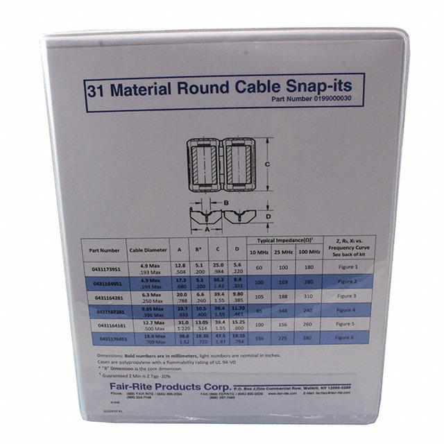 This is manufactured by Fair-Rite Products Corp.. The manufacturer part number is 0199000030. The fair-rite products corp.'s product offers user-desired applications. The ferrite cores - cables and wiring is designed to provide robust applications in a variety of specific settings. The product is available in free hanging configuration. It is assigned with possible HTSUS value of 8504.90.9630. The product is rohs3 compliant. In addition, it is reach unaffected. In addition, bulk is the available packaging type of the product. Its typical moisture sensitivity level is not applicable. It has a long 8 weeks standard lead time. The product is designated with the ear99 code number. Available in 18 pieces (6 values - mixed quantities) quantity.