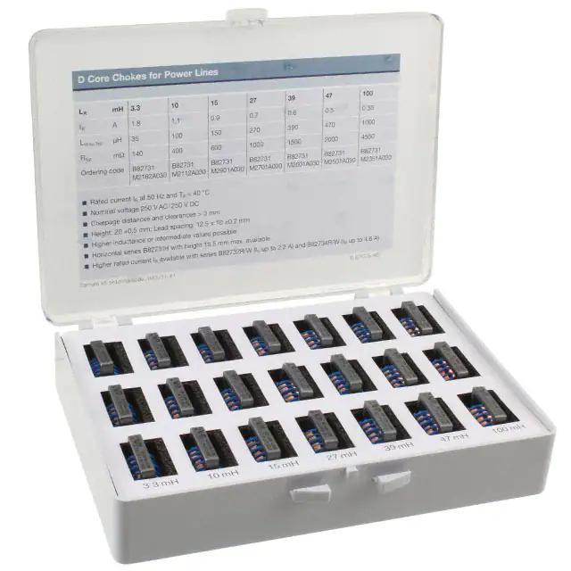 This is manufactured by TDK Electronics Inc.. The manufacturer part number is B82731X0001. It has typical 12 weeks of manufacturer standard lead time. It features common mode chokes for power lines kit assorted through hole. The common mode chokes for power lines is designed to provide robust applications in a variety of specific settings. The product is available in through hole configuration. The product b82731m, is a highly preferred choice for users. In addition, plastic box with bin guide is the available packaging type of the product. Available in assorted quantity. The tdk electronics inc.'s product offers user-desired applications.