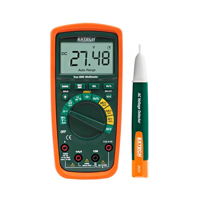 This is manufactured by FLIR Extech. The manufacturer part number is MN62-K. It is assigned with possible HTSUS value of 9030.31.0000. It is shipped in box package . Its typical moisture sensitivity level is not applicable. This is a type of electrical maintenance and test, a set with user-desired tools. The product carries a unique equipment part number dv23, mn62. Moreover, it corresponds to mn62, a base product number of the product. It has a long 6 weeks standard lead time. The product is a special multimeter, voltage detector equipment. The product is designated with the 3a992a code number.