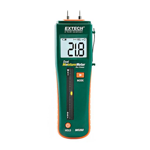 This is manufactured by FLIR Extech. The manufacturer part number is MO260. It is assigned with possible HTSUS value of 9025.80.5000. Its typical moisture sensitivity level is not applicable. The product is also supplied with battery, cap, case, replacement pins. In addition, box is the available packaging type of the product. It has a long 6 weeks standard lead time. The flir extech's product offers user-desired applications. It comes in moisture meter configuration. It is ideal for measuring humidity, moisture. The product is designated with the ear99 code number.