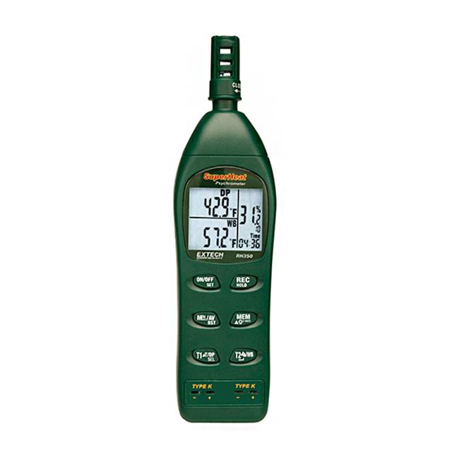 This is manufactured by FLIR Extech. The manufacturer part number is RH350. It is assigned with possible HTSUS value of 0000.00.0000. It is shipped in box package . Its typical moisture sensitivity level is not applicable. The product is also supplied with battery, temperature probe. It has a long 6 weeks standard lead time. It comes in psychrometer configuration. It is ideal for measuring air flow, humidity, temperature.