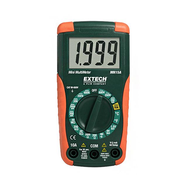 This is manufactured by FLIR Extech. The manufacturer part number is MN15A. Additionally, the product is designed with handheld Style. It is assigned with possible HTSUS value of 9030.31.0000. It also offers extra functions, such asbattery test, continuity, diode test. It comes in digital (dmm) configuration. Ranging Options - manual. It performs basic function of voltage, current, resistance, temperature. The product is also supplied with battery, probes. The product offers true rms response and is easy to use. The flir extech's product offers user-desired applications. The product has a typical of 2000 display count. Its typical moisture sensitivity level is not applicable. It features a remarkable lcd display. The splendid features of the product include auto off, backlight, hold. The product minitec®, is a highly preferred choice for users. It is supplied with 4.0 display digits. In addition, box is the available packaging type of the product. The product is designated with the 3a992a code number.