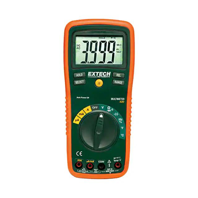 This is manufactured by FLIR Extech. The manufacturer part number is EX420. Additionally, the product is designed with handheld Style. It is assigned with possible HTSUS value of 0000.00.0000. It also offers extra functions, such asbattery test, continuity, diode test. It comes in digital (dmm) configuration. Ranging Options - auto. It performs basic function of voltage, current, resistance, capacitance, temperature, frequency. The product is also supplied with battery, case, probe, strap. The product offers average response and is easy to use. The product has a typical of 4000 display count. It is shipped in box package . Its typical moisture sensitivity level is not applicable. It features a remarkable lcd display. The splendid features of the product include auto off, backlight, hold. The product 400, is a highly preferred choice for users. It is supplied with 4 display digits. The product is designated with the obsolete code number.