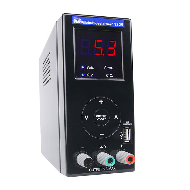 This is manufactured by Global Specialties. The manufacturer part number is 1325. It is assigned with possible HTSUS value of 8504.40.9580. The product is rohs compliant. The product features power and watts of 80w. Its typical moisture sensitivity level is 1 (unlimited). It comes in bench (ac to dc) configuration. Current regulation - line of 10ma. The product allows 20mv of line voltage regulation. While, the output current includes 0 ~ 5a. The voltmeter; Ammeter accuracy value includes 1% rdg + 3 digits. It is shipped in box package . The product's diameters include 7.900" l x 6.000" w x 2.800" h (200.66mm x 152.40mm x 71.12mm). Ripple - 20mv rms. Consists of 3 characters. While load current regulation is 300ma. It has a long 12 weeks standard lead time. While the load voltage regulation of 50mv. It features a remarkable led display. The splendid features of the product include usb charge port(s). Furthermore, the output voltage is 1 ~ 16vdc. It has optimum voltage supply of 100 ~ 120vac. Additionally, the product is supplied with 1 outputs. The product is designated with the 3a992a code number.