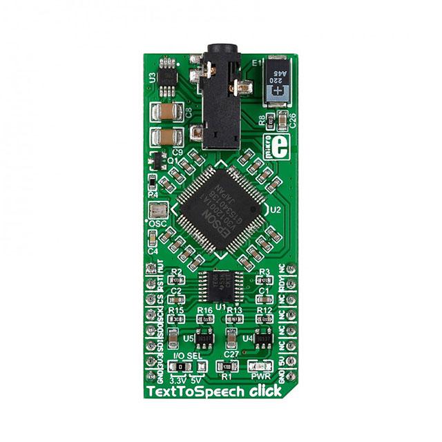 This is manufactured by MikroElektronika. The manufacturer part number is MIKROE-2253. The product is highly suitable for mikrobus. Featured Device s1v30120. The kit is classified as development board. This kit is known as texttospeech click, consists of highly versatile and user-desired tools. It is assigned with possible HTSUS value of 8473.30.1180. The product is rohs3 compliant. Platform Info: mikrobus™ click™. It comes in audio configuration. It performs basic function of text-to-speech synthesizer. In addition, it is reach unaffected. The mikroelektronika's product offers user-desired applications. Its typical moisture sensitivity level is 1 (unlimited). It has a long 2 weeks standard lead time. Additionally, [Utilised IC / Part] is the used part of the product. In addition, bulk is the available packaging type of the product. Contents Include: board(s). The product is designated with the ear99 code number.