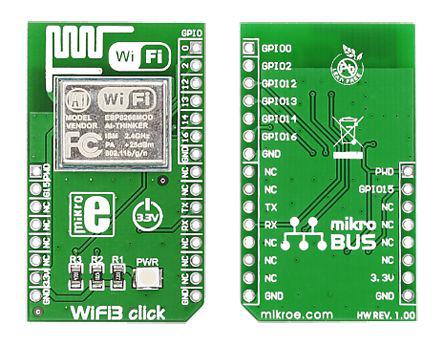 This is WiFi3 Click manufactured by MikroElektronika. The manufacturer part number is MIKROE-1769. Featured Device esp8266. This kit is known as wifi3 click, consists of highly versatile and user-desired tools. In addition, the product is created using wifi RF technology . Supplied with 2.4ghz of frequency. The kit is classified as mikrobus click board. It performs basic function of wifi. Additionally, [Utilised IC / Part] is the used part of the product. It is assigned with possible HTSUS value of 8473.30.1180. It is shipped in box package . Its typical moisture sensitivity level is 1 (unlimited). Platform Info: mikrobus™ click™. It comes in rf configuration. Contents Include: board(s). The product is designated with the 5a002a1 code number.