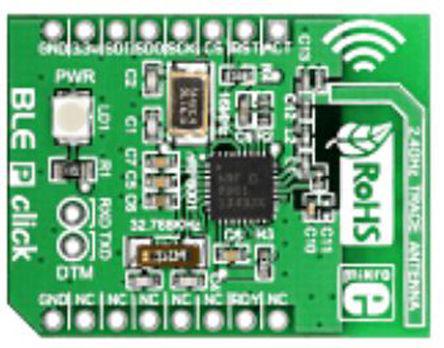 This is mikroBus add-on BLE P Click Bluetooth LE manufactured by MikroElektronika. The manufacturer part number is MIKROE-1597. In addition, the product is created using bluetooth smart (ble) RF technology . The kit is classified as mikrobus click board. This kit is known as ble p click, consists of highly versatile and user-desired tools. Featured Device nrf8001. It performs basic function of bluetooth low energy (ble). Additionally, [Utilised IC / Part] is the used part of the product. It is assigned with possible HTSUS value of 8473.30.1180. It is shipped in bulk package . The product is rohs3 compliant. Its typical moisture sensitivity level is 1 (unlimited). Platform Info: mikrobus™ click™. Contents Include: board(s). It has a long 4 weeks standard lead time. It comes in rf configuration. The product is designated with the 5a002a1 code number.