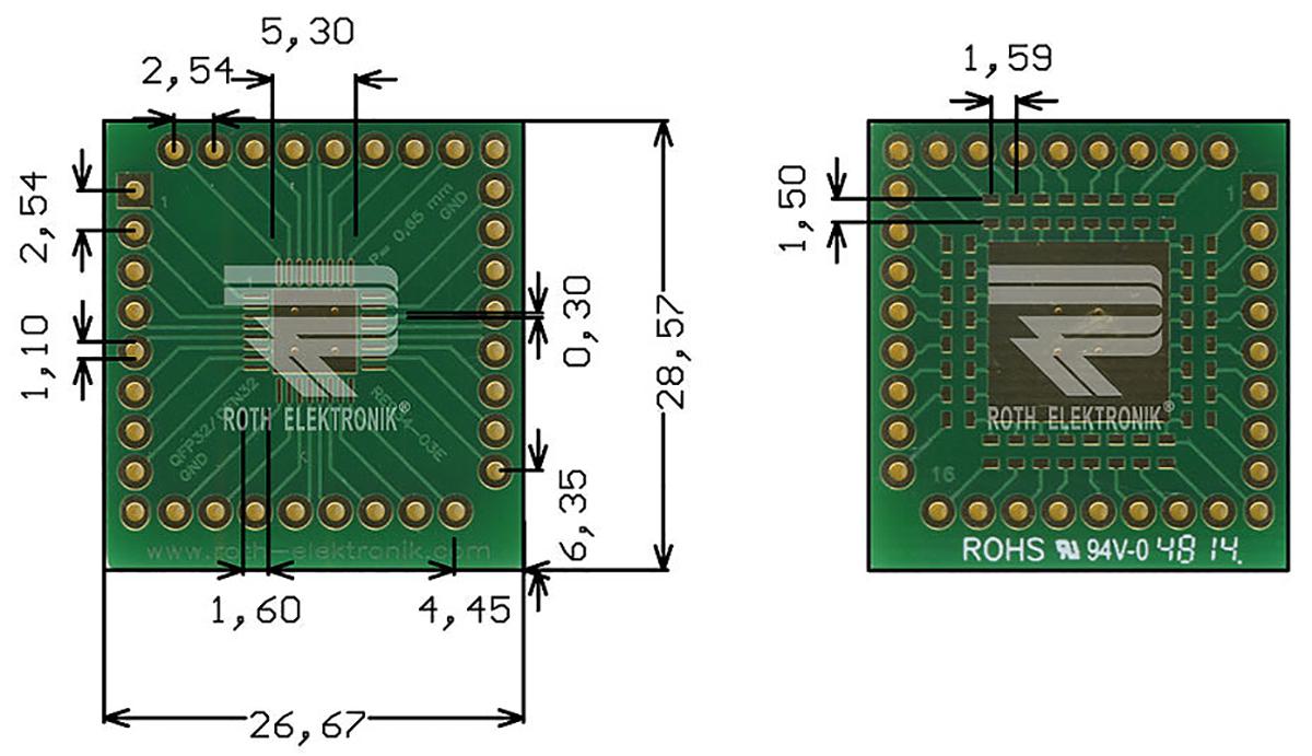 This is Double Sided Extender Board Adapter Multiadapter With Adaption Circuit Board 28.57 x 26.67 x 1.5mm manufactured by Roth Elektronik. The manufacturer part number is RE934-03E. Its copper thickness is about 35µm . The given dimensions of the product include 28.57 x 26.67 x 1.5mm. It is 1.5mm thick. Furthermore, the product is 26.67mm wide. Its accurate length is 28.57mm. Its base is made up of epoxy fibre-glass material . It comes in multiadapter with adaption circuit board configuration. Additionally, it is/has 2 sides .