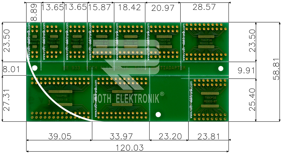 This is Surface Mount (SMT) Board TSSOP Epoxy Glass Double-Sided 120.03 x 58.81 x 1.5mm FR4 manufactured by Roth Elektronik. The manufacturer part number is RE933. Moreover, its FR material is of fr4 grade . Its copper thickness is about 35µm . The given dimensions of the product include 120.03 x 58.81 x 1.5mm. In addition, it has a/an tssop type SMD component . Its base is made up of epoxy glass fabric laminate material . Furthermore, the product is 58.81mm wide. Its accurate length is 120.03mm. It is 1.5mm thick. It comes in multi adapter board configuration. Additionally, it is/has 2 sides .