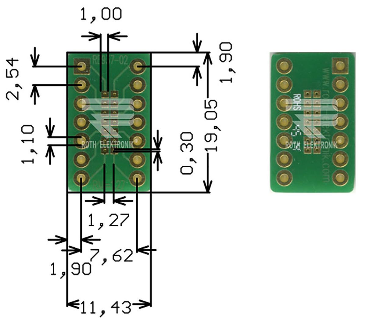 This is Double Sided Extender Board Adapter Multiadapter With Adaption Circuit Board 19.05 x 11.43 x 1.5mm manufactured by Roth Elektronik. The manufacturer part number is RE937-02. Its copper thickness is about 35µm . The given dimensions of the product include 19.05 x 11.43 x 1.5mm. Its base is made up of epoxy fibre-glass material . Furthermore, the product is 11.43mm wide. Its accurate length is 19.05mm. It is 1.5mm thick. It comes in multiadapter with adaption circuit board configuration. Additionally, it is/has 2 sides .