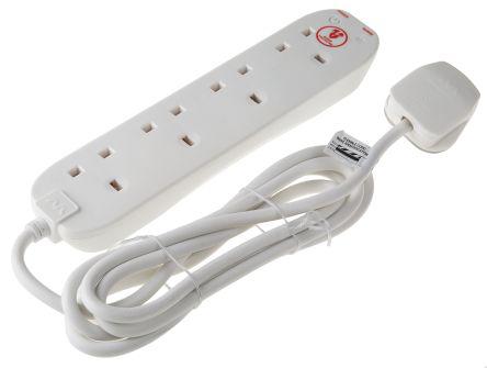 This is Type G - British 4 Gang Extension Leads 2m Cable Filtered 13A Surge Protected manufactured by RS Pro. The manufacturer part number is 696-3651. It includes 4 dedicated sockets . It has a decent white colour. It has a surge protection feature yes . The type g - british socket offers profound benefits and is well-designed.