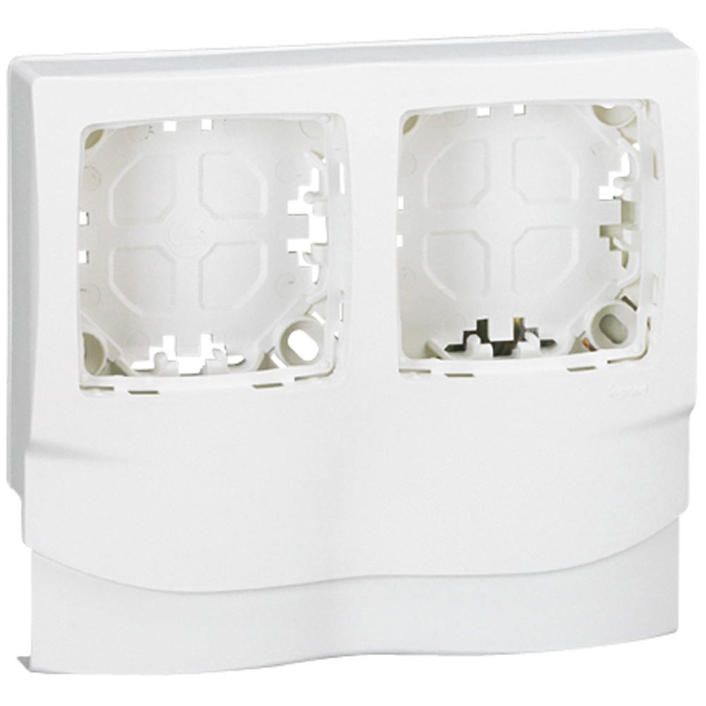This is White 2 Gang Plastic Mounting Frame manufactured by Legrand. The manufacturer part number is 0 314 14. The product is available in surface mount style. It has a decent white colour. The product is made from highly stable and reliable plastic. It comprises 2 gangs.