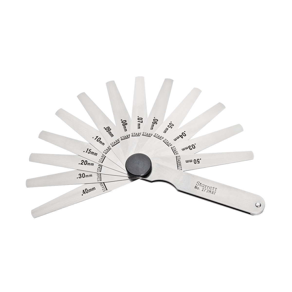 This is Steel Feeler Gauge 13 Blades manufactured by Starrett. The manufacturer part number is 173 MAT. It is available in metric package. It is 0.03 → 0.5mm thick. Its accurate length is 77mm. It is calibrated ukas . The included number of blades is/are 13 . In addition, its blade is made up of steel material .