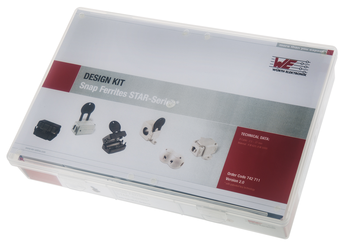 This is 33 piece Ferrite Design Kit Includes Snap Ferrite manufactured by Wurth Elektronik. The manufacturer part number is 742711. The product consists of 33 pieces. It includes a/an snap ferrite kit .