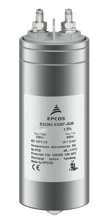 This is 600μF Polypropylene Capacitor PP 350V ac ±5% Tolerance B32362 Series manufactured by EPCOS. The manufacturer part number is B32362B2607J050. The given dimensions of the product include 85 (dia.) x 247 hmm. It has 1.8mω equivalent series resistance. The product b32362, is a highly preferred choice for users. It provides a dissipation factor of <lteq/>1 x 10⁻³%. In addition, the height is 247mm. It provides a 600µf of capacitance value. It carries a 350v ac of voltage. Whereas, the minimum operating temperature of the product is -40°c. The lead is 30.5mm long. The lead features 35mm pitch. It has a maximum operating temperature of +70°c. It features ±5% of tolerance value. The terminal is a screw terminal type. The dielectric options include polypropylene.