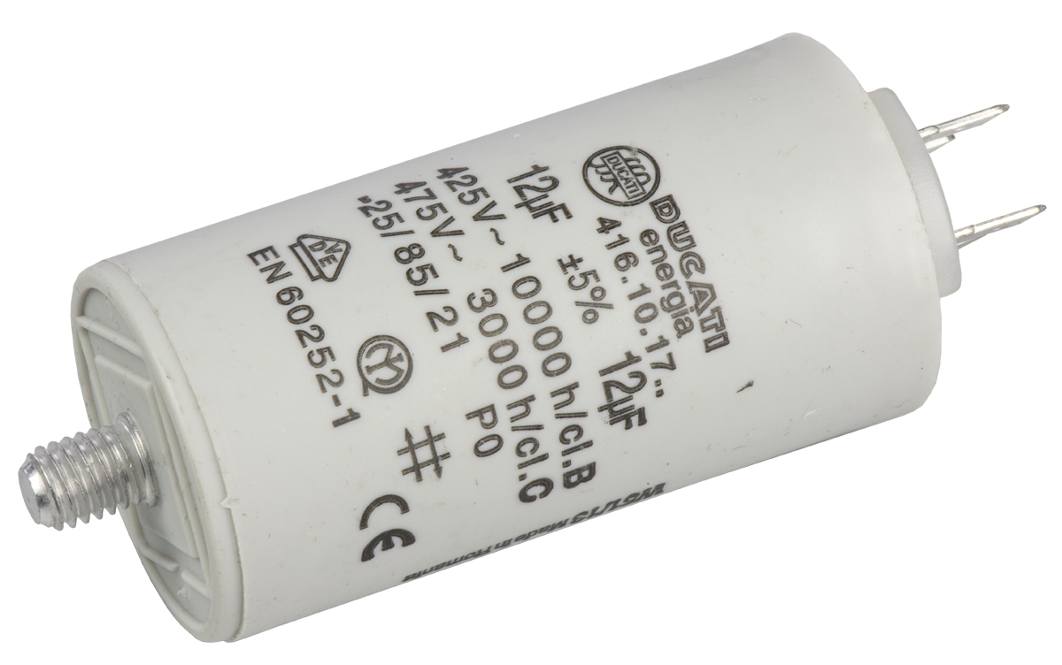 This is 12μF Polypropylene Capacitor PP 450V ac ±5% Tolerance Stud Mount 4.16.10 Series manufactured by Ducati Energia. The manufacturer part number is 4.16.10.17.64. The given dimensions of the product include 36 (dia.) x 70mm. The product is available in stud mount configuration. The product 4.16.10, is a highly preferred choice for users. In addition, the height is 70mm. It provides a 12µf of capacitance value. It carries a 450v ac of voltage. It features ±5% of tolerance value. The terminal is a stud mount type. The dielectric options include polypropylene.